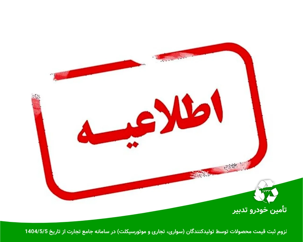 لزوم ثبت قیمت محصولات توسط تولیدکنندگان (سواری، تجاری و موتورسیکلت) در سامانه جامع تجارت از تاریخ 1404/5/5 مشاهده اطلاعیه » تیر 31, 1404 بدون دیدگاه
